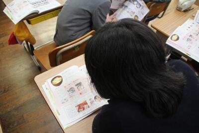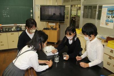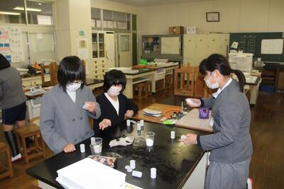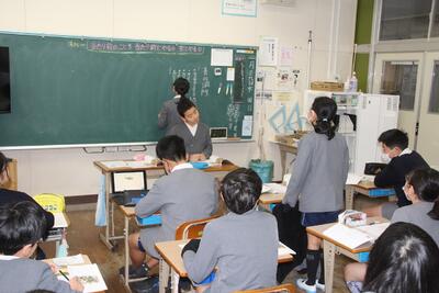 家庭科では、「食べて元気に」という食に関する学習をしています。この日は、食品の栄養素やごはんとみそ汁の作り方について学習しました。栄養素の観点からみそ汁の実を考えました。3学期に行う調理実習に備えて、ごはんの炊き方についても確認しました。