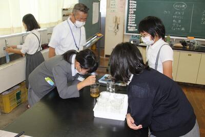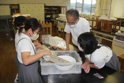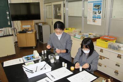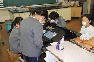 理科では、もののとけ方について学習しています。この日は、物が水に溶ける量には限りがあるか、食塩とミョウバンを使って実験を行いました。それぞれ5gずつ入れて、溶けたらさらに5gずつ入れていきました。タブレットPCを使って、溶けたことを撮影したり、実験結果を記録したりしました。