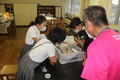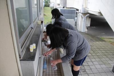 理科では、炭酸ガスロケットづくりを行いました。フィルムケースにクエン酸と重曹・水を入れて、発生する炭酸ガスの力でロケット(フィルムケース)を飛ばすというものです。クエン酸と重曹・水の量のバランスやフィルムケースのふたの閉まり具合で飛び方が異なるようです。飛び出す前のドキドキ感がたまらないです。