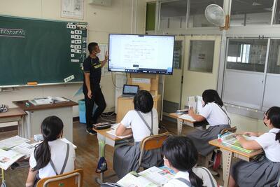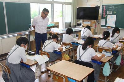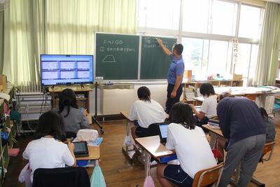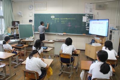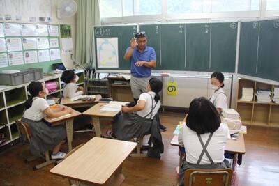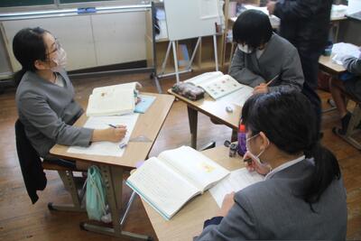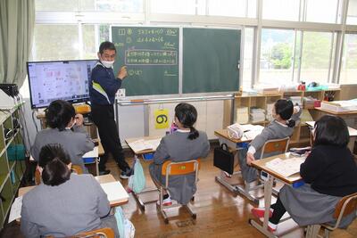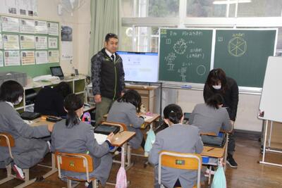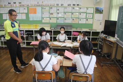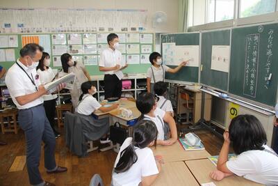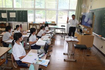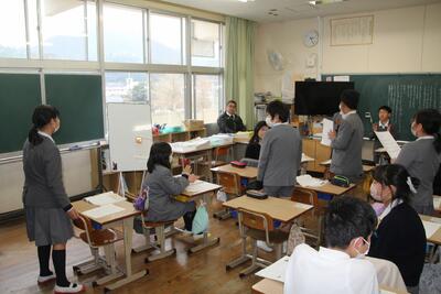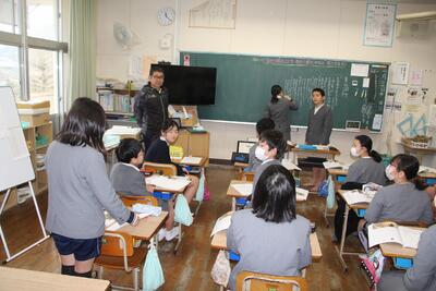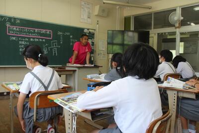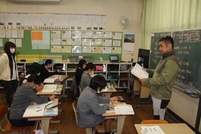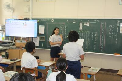 国語科では、物語「たずねびと」を使って、物語の全体像をとらえ考えたことを伝え合う学習をしています。この日は、東陽中学校のF先生と一緒に学習しました。人物像や心情の変化、情景などをもとに、物語の全体像を読み取っていきました。これから感じたことや考えたことを伝え合っていきます。