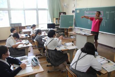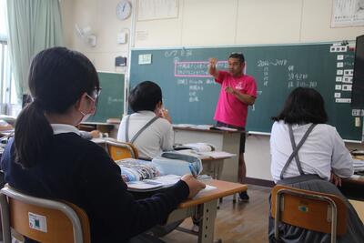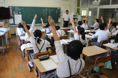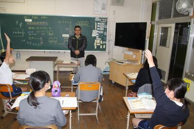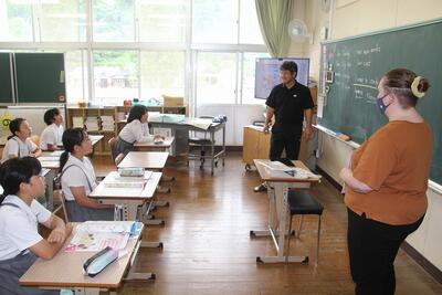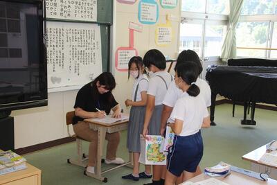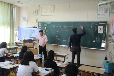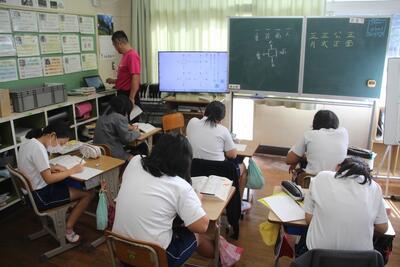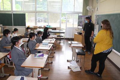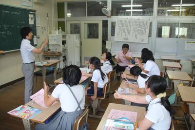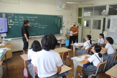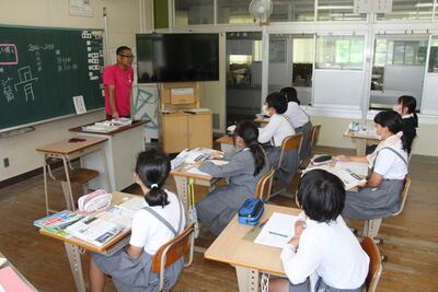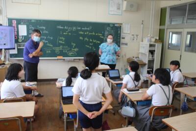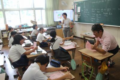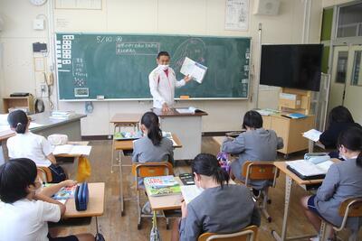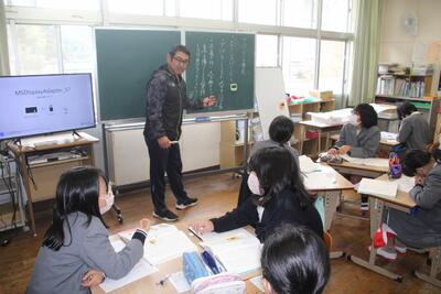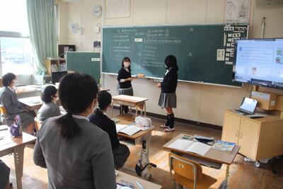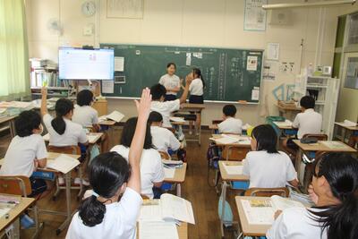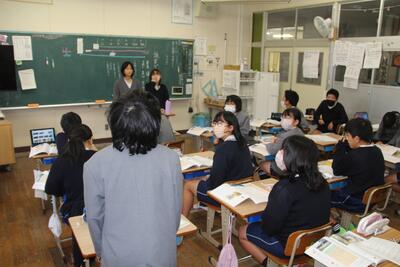 外国語では、東陽中学校のN先生と一緒に学習をしました。M先生から疑問詞の歌を教えてもらい、歌いながら楽しく疑問詞について理解することができました。歌の最後の「イェイ」がとても楽しく盛り上がりました。N先生、ありがとうございました。