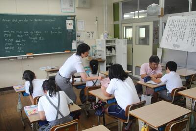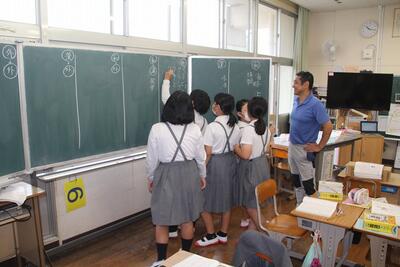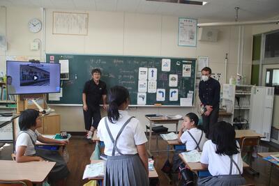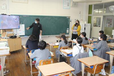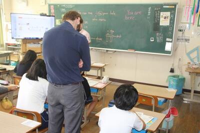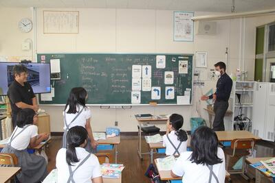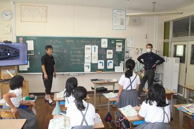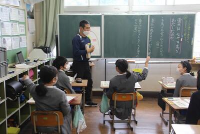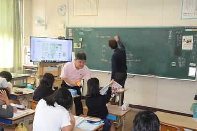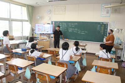 外国語科では、場所をたずねたり答えたりする学習をしています。この日は、ALTのJ先生の発音を聞きながらいろいろな場所の言葉を練習しました。次に、J先生に日本語では何というのかを質問しました。授業を通して、先生や子どもたちの語学力がアップしています。