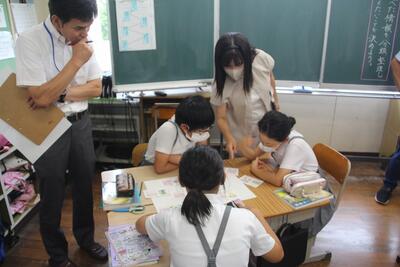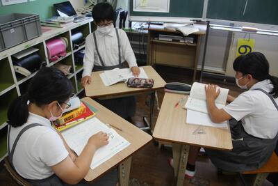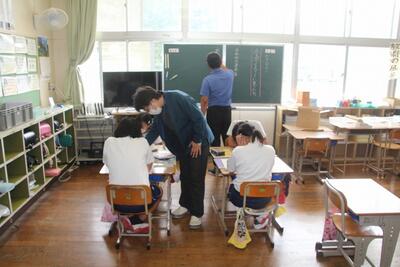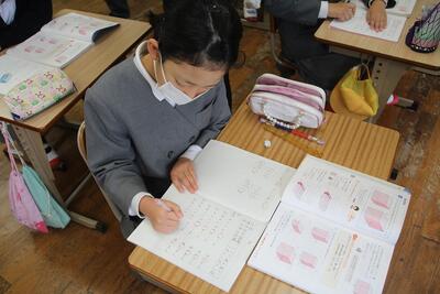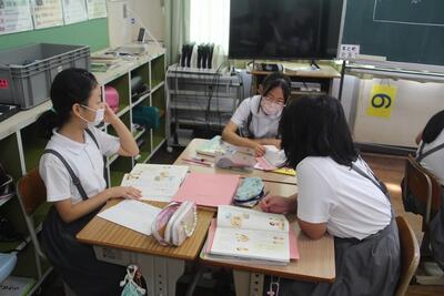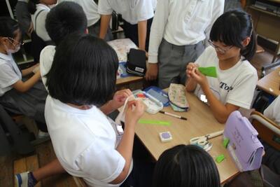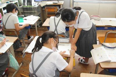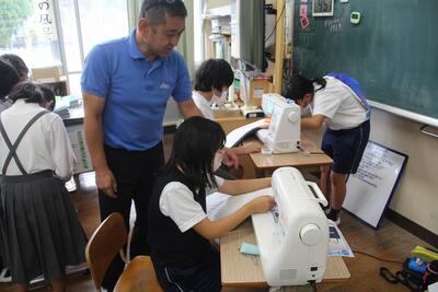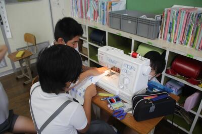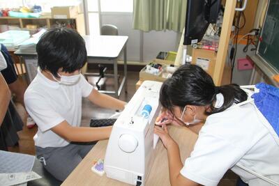 家庭科では、裁縫の学習をしています。玉結びや玉留め・なみ縫いなどを行いました。5・6年生は複式学級なので、昨年経験した6年生が5年生に優しく教えました。複式学級のよさを生かした学習をしています。