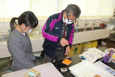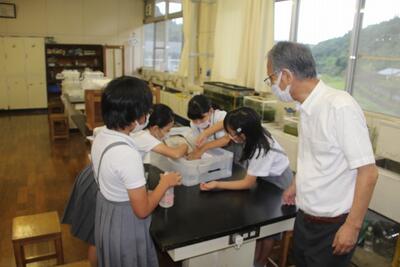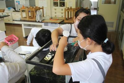 理科では、メダカのたんじょうについて学習しています。本校には大きな水槽で30尾程のメダカを飼っています。今のところ20個の卵が生まれて、そのうち3つがふ化しそうです。この日は、産み付けた卵を丁寧にとり、双眼顕微鏡で観察しました。生命のつながりを実感した5年生です。