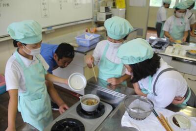 ご飯とみそしるの調理実習を行いました。ご飯は炊飯器ではなく、透明な鍋で炊きました。自分たちで水の量や火加減を調節して、時間を計りながら炊き上げました。みそしるは鰹節で出しをとり、大根や油揚げなどグループで考えた実を入れて作りました。おいしくできたので、今度は家族にごちそうしてくれるでしょう。