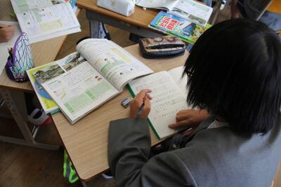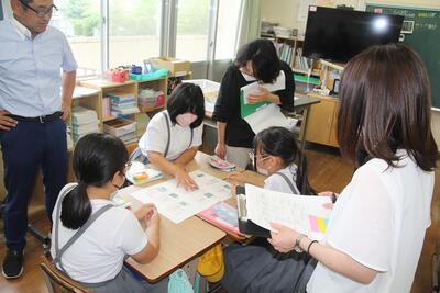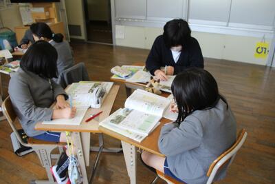 国語科では、資料などを用いた文章の効果を考え、それを生かして意見文を書く学習をしています。この日は、説明文「固有種が教えてくれること」の中に用いられている資料や図の効果について考えました。グループに分かれて考えをまとめ、全体で交流しました。