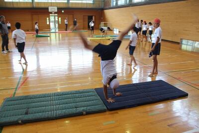 マット運動では、6年生と一緒に連続技の学習をしています。前転や後転・側方倒立回転・倒立系の技を組み合わせて、連続技を行っています。6年生と教え合いながら、美しい技になるように活動しています。