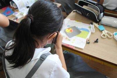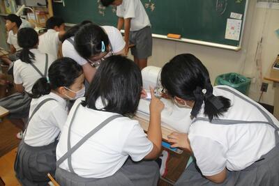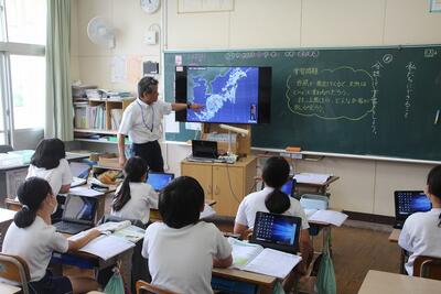 理科では、台風についての学習を行いました。台風が日本列島に接近すると、どのようなことが起こるのかを資料をもとに調べました。雲の量と動き、風の強さと向き、降水量などが変っていくことが分かりました。天気予報で台風の進路や予想される災害を想定して、行動できるように学習しています。