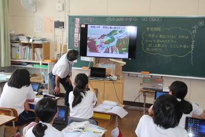理科では、人のたんじょうについて学習しています。この日は、人・メダカ・植物の育ち方の違いについて考えました。自分の考えをタブレットPCに入力し、みんなで考えを共有しました。新たな視点を与えてくれた考えに、コメントを入力して伝え合いました。コメントをもらった児童がとてもうれしそうにしていました。