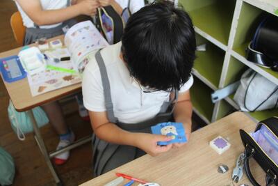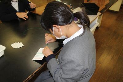 理科では、電磁石の性質についての学習が終わりました。この日は、電磁石を利用したおもちゃを作りました。コイルの巻き数を多くした強力電磁石や、磁石のしりぞけ合う力を生かした「ひらひらチョウ」を作りました。電源装置を使って多数のクリップを引きつけたり、チョウをひらひら動かしたりして、電磁石の楽しさを味わいました。