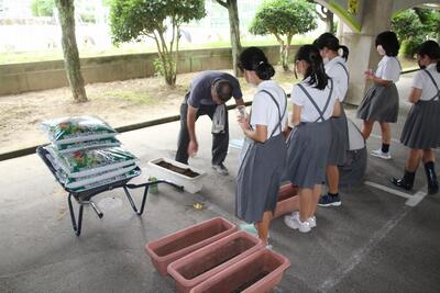 理科では、2学期に学習する「植物の実や種子のでき方」のために、アサガオの種まきをしました。一人1鉢のプランターに土を入れて種をまき支柱を立てました。夏休み期間も大切に育てて、2学期の学習に備えます。