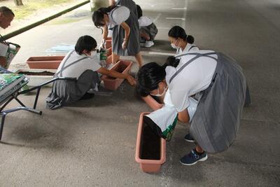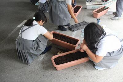 理科では、植物の発芽と成長について学習を始めました。この日は、植物の発芽の条件について考え、水・空気・肥料・日光などの条件を変えて行う実験の準備をしました。プラのコップの底に穴を開け、バーミキュライト(土壌改良の土)を入れ、インゲン豆の種子を入れました。結果がとても楽しみです。
