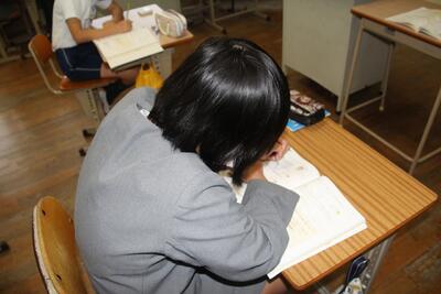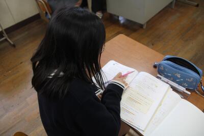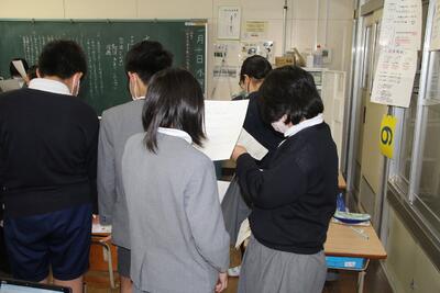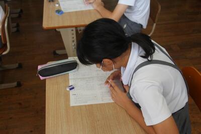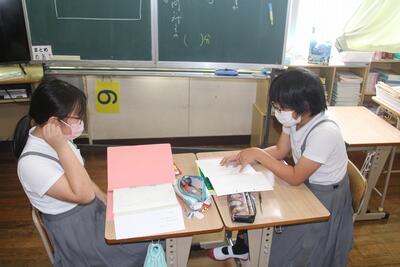 理科では、まとめのテストを行いました。1年間の学習からの出題なので、実験器具や実験内容などを忘れていた人がいました。テストを返してもらい、教科書やノートを使ってやり直しを行いました。しっかり復習をして、次の学年に生かしていきます。