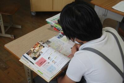 社会科では、未来を支える食料生産という学習に入りました。この日は、日本の主な食料の産地について調べました。牛や豚・野菜・果物・穀物類などについて主な産地が教科書に掲載されています。その中で、熊本県にはトマトとみかんがありました。日本全国から私たちの食卓に食料が届くことを改めて知りました。