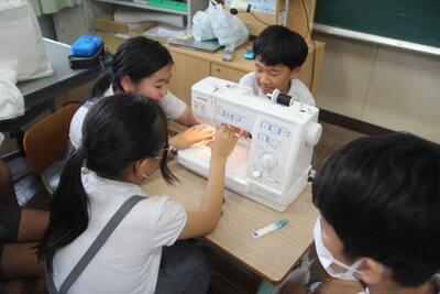 家庭科では、ミシンの使い方について学習しました。昨年度学習した6年生から教えてもらいながらぞうきんを作りました。上糸や下糸の調節したり、押さえホルダーを上下したり、スタート・ストップをボタンを押したりして、ミシンで縫っていきました。手縫いとの違いや、まっすぐ縫い進む難しさなどが分かった5年生です。