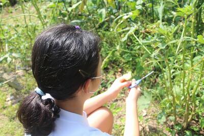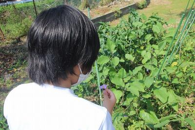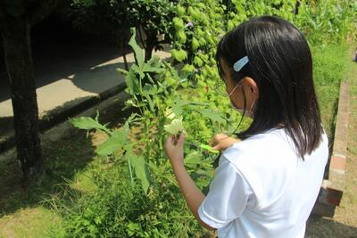 理科では、植物の実や種子のでき方について学習しています。この日は、花のつくりを調べるために学級園に植えてあるピーマンやナス・オクラ・ツルレイシの花を調べました。