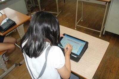 算数科では、分数の学習をしています。この日は、異分母の分数の大きさ比較を行いました。タブレットPCに自分の考えを書き込み、伝え合いました。等しい分数の既習事項を使って、通分することを確認しました。考えを共有するのにタブレットPCが大活躍しています。