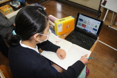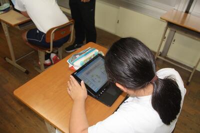 理科では天気の変化について学習しています。この日は天気がよすぎて、雲が少なく観察するには条件がよくありませんでした。雲の量や動きをタブレットPCで撮影して、観察記録にまとめました。画像データがあるのでとても便利です。