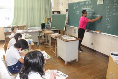 算数科では、平均とその利用について学習しています。この日は、部分の平均から全体の平均を求める学習でした。学習リーダーを中心に自分たちで考えを伝え合い学習を進めました。