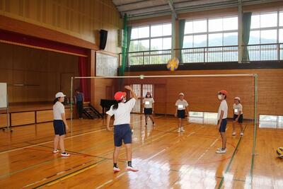 体育科では、ネット型ゲームのソフトバレーボールを学習しています。この学習では、チームで作戦を考え役割分担をしてゲームを行っています。コート上のポジションやボールを持たない人の動き・チームメイトへの声かけなど、チームワークの大切さを学んでいます。