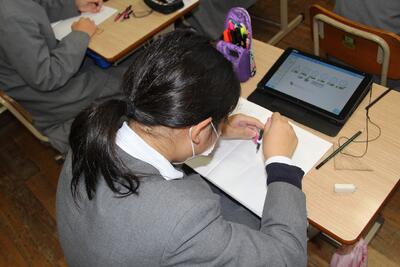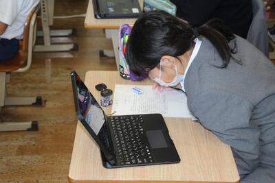 先日行った修学旅行の平和学習フィールドワークでお世話になったガイドのT様にお礼の手紙を書きました。まずは、タブレットPCを使って下書きをしました。時候のあいさつ、お礼の言葉、フィールドワークで印象に残っていることなど、自分の言葉で書いていきました。ガイドのT様がこの手紙を読んで、喜んでくださったらうれしいです。
