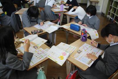 国語科では、古文を音読し言葉の響きやリズムに親しむ学習を行いました。清少納言の「枕草子」にある「冬はつとめて。~」を音読し、言葉の意味などを調べました。平安時代の冬の早朝の風景を想像し、言葉の美しさやリズムの楽しさを味わいました。