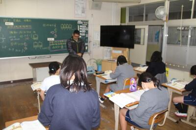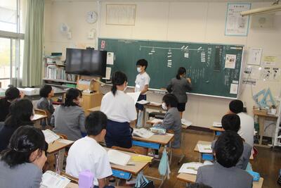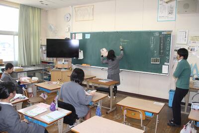 算数科では、単位量あたりの大きさの学習に入りました。この日は、「1枚あたり何円」または「1円あたり何枚」のどちらで求めた方がよいかについて考えました。「答えが小数より整数の方が分かりやすい」や「1枚あたり何円のほうが高いか安いかの判断がしやすい」等の意見が出ました。学習リーダーを中心にみんなで学習を進めることができる5年生です。