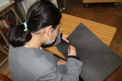 図工科では、東陽中学校のH先生と一緒に切り絵の学習を行っています。表したい絵をイメージして、黒画用紙に写していきます。絵が細かすぎると切る作業が難しくなるので、工夫が必要です。写し取った黒画用紙をアートナイフで切り取っていきます。紙を回しながら一つ一つ丁寧に切っています。切り取ったスペースには作品に合う色紙を貼って行きます。どんな作品ができあがるのでしょうか。