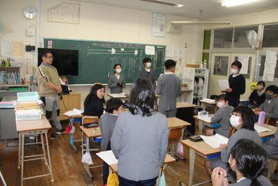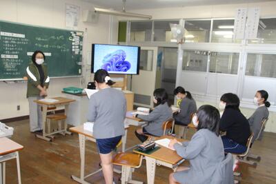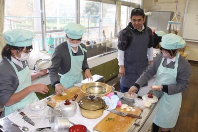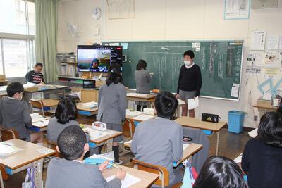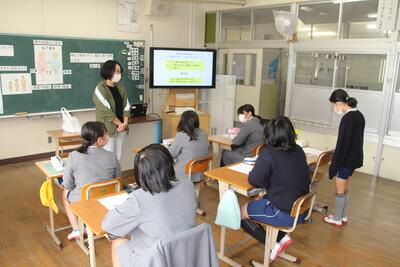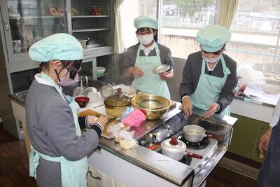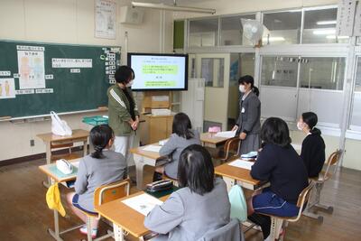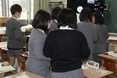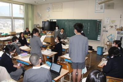 家庭科では、「食べて元気に」という食に関する学習をしています。この日は、食品の栄養素やごはんとみそ汁の作り方について学習しました。栄養素の観点からみそ汁の実を考えました。3学期に行う調理実習に備えて、ごはんの炊き方についても確認しました。