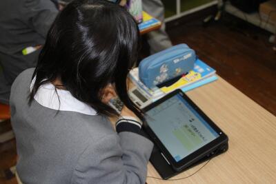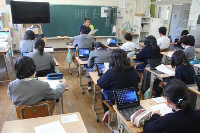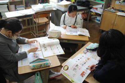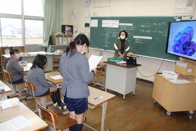 学年末が近づいています。他教科と同様に外国語科でもまとめのテストを行いました。テスト用紙のQRコードを読み取り、ヒアリングのテストを行いました。タブレットPCにイヤホンを接続し、流れてくる音声を聞き取り問題に答えてました。3~4文の問題から、「だれ・いつ・何を」などについて答えました。聞き取りテストも個別に行っています。
