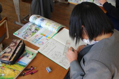 理科では、まとめのテストを行いました。1年間の学習からの出題なので、実験器具や実験内容などを忘れていた人がいました。テストを返してもらい、教科書やノートを使ってやり直しを行いました。しっかり復習をして、次の学年に生かしていきます。