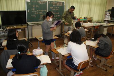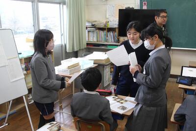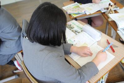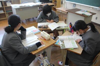 国語科では、資料などを用いた文章の効果を考え、それを生かして意見文を書く学習をしています。この日は、説明文「固有種が教えてくれること」の中に用いられている資料や図の効果について考えました。グループに分かれて考えをまとめ、全体で交流しました。