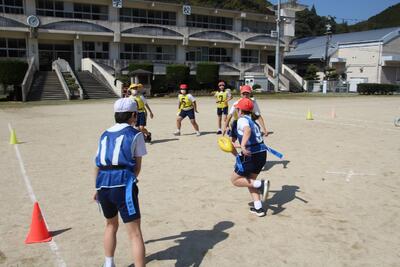 体育科では、タグラグビーの学習をしています。ラグビーのタックルの代わりに、腰につけたタグ(はちまき)を取って守るというゲームです。4年生時に経験があるので、ボール保持者の後ろについてパスを受けて、攻撃する形はできつつあります。タグを取られた瞬間が守備側の人数が減るので、スペースが生まれたり、マークが外れたりして、トライ(得点)のチャンスが高くなります。チームで作戦を立ててゲームを楽しんでいます。