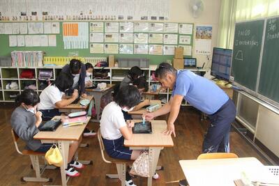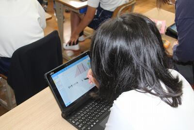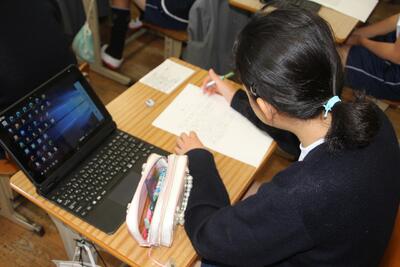 算数科では、三角形や四角形の面積を求める学習しています。この日は、台形の面積の求め方を考えました。台形を三角形や四角形の形を変えて、面積の求め方をタブレットPCに書き込みました。これまでの学習を生かして、新しい考え方へとつないでいく5年生です。