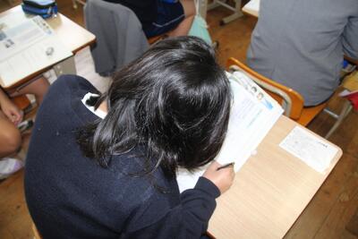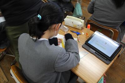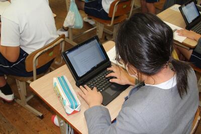 先日行った修学旅行の平和学習フィールドワークでお世話になったガイドのT様にお礼の手紙を書きました。まずは、タブレットPCを使って下書きをしました。時候のあいさつ、お礼の言葉、フィールドワークで印象に残っていることなど、自分の言葉で書いていきました。ガイドのT様がこの手紙を読んで、喜んでくださったらうれしいです。