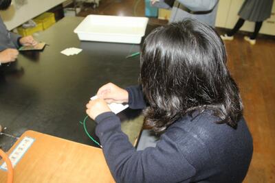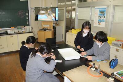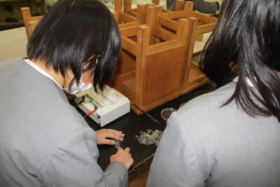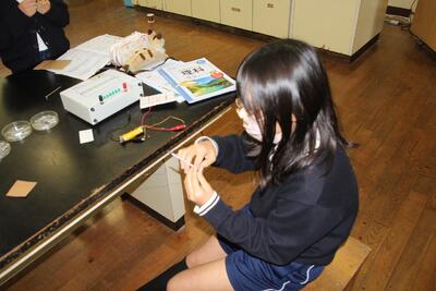 理科では、電磁石の性質についての学習が終わりました。この日は、電磁石を利用したおもちゃを作りました。コイルの巻き数を多くした強力電磁石や、磁石のしりぞけ合う力を生かした「ひらひらチョウ」を作りました。電源装置を使って多数のクリップを引きつけたり、チョウをひらひら動かしたりして、電磁石の楽しさを味わいました。