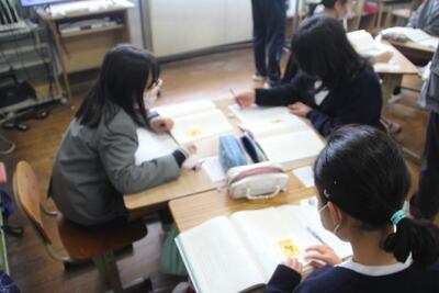 国語科では、古文を音読し言葉の響きやリズムに親しむ学習を行いました。清少納言の「枕草子」にある「冬はつとめて。~」を音読し、言葉の意味などを調べました。平安時代の冬の早朝の風景を想像し、言葉の美しさやリズムの楽しさを味わいました。