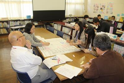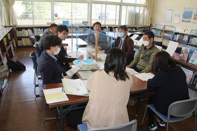 5・6年複式学級国語科の研究授業を行い、その授業後に授業研究会を行いました。サポートセンターのN先生を講師としてお招きしました。授業者の自評・質疑応答後に3つのグループに分かれて、成果や課題・代案等について検討しました。各グループからは、児童の学習意欲の高さや複式授業での同時導入・同時終末の効果、単元のゴール設定や学習リーダーの役割などについての発表がありました。N先生からは、複式学級の学級づくりや授業づくり、直接・間接指導における留意点、リーダー学習における質の向上などについて、わかりやすく丁寧に助言をしていただきました。今後の私たちの学級づくりや授業づくりに生かしていきます。N先生、ありがとうございました。