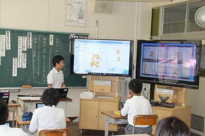 特別支援学級の児童とN先生による自立活動の研究授業と授業研究会を行いました。研究授業では、スクラッチというアプリケーションソフトを使ったプログラミングを活用して、「自分の考えをしっかり伝えよう」という学習でした。自分が作成したプログラムを説明して一緒に作成したり、分からないところを質問したりしました。授業研究会では、八代市教育サポートセンターのNサポーターを講師にお招きして、授業の成果と課題について検討しました。Nサポーターから、ICTの活用や複式学級での思考性のある教育活動の積み上げ・児童の実態把握と信頼関係づくり・場に応じた即時支援の効果などについて成果をあげていただきました。また、児童主体の目標設定と振り返り、通常学級における自立活動的な学習について助言をいただきました。本校の特別支援教育のさらなる推進について大変参考になりました。特別支援学級の児童、授業者のN先生、Nサポーター、ありがとうございました。