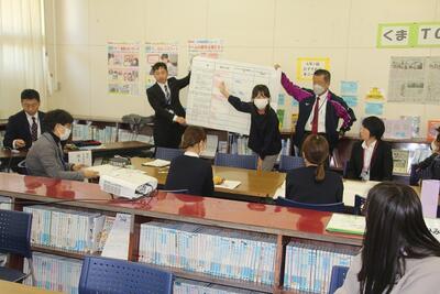 東陽小学校と東陽中学校の合同研修会を行いました。今回は、東陽中学校のM先生の1年社会科「巨大な工業生産力」と、S先生の2年理科「前線と天気の変化」の公開授業でした。どちらも知識構成型ジグソー法を活用した生徒主体の学習と、ICTを活用した定着確認の徹底などが行われていました。公開授業後は社会科グループと理科グループに分かれて、授業づくりについて語り合いました。その後、全員で意見や考えなどを共有し、八代市教育委員会のJ指導主事からまとめをしていただきました。児童生徒の主体的な学びをつくるために、校種の垣根を越えて9年間で育む力について考え実践に踏み出す貴重な機会となりました。東陽中学校のM先生とS先生、八代市教育委員会のJ指導主事、ありがとうございました。