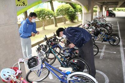 K商会さんとPTA環境美化・安全委員の方に、自転車点検をしていただきました。ほとんどの自転車は整備良好でした。一部にベル・ブザーの不良がありました。防犯登録やTSマークの表示がなかったものがあり、これから改善すべきことが見えてきました。K商会さんと環境美化・安全委員の皆さん、ありがとうございました。