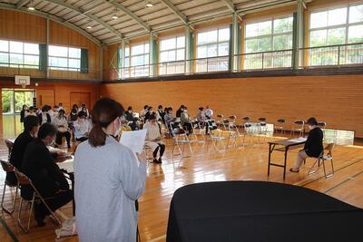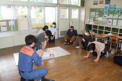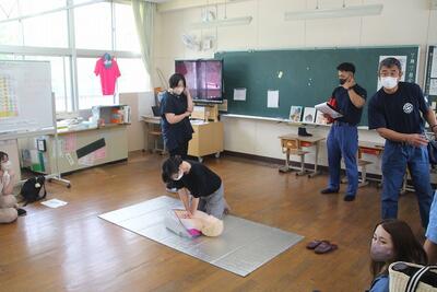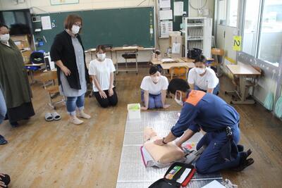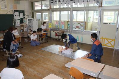 本校では4年ぶりに夏休みのPTAプール開放が行われます。そこで、PTA会員を対象に救急救命講習を行いました。鏡消防署氷川分署から5人の講師をお招きして、各教室等に分散して行いました。意識や呼吸の確認、通報やAEDの依頼、通報訓練や胸骨圧迫の仕方、AEDの操作など、実践を想定した講習でした。いざというときにためらうことなくできるように、参加した保護者の方は真剣な表情で受講しました。氷川分署の皆様、ありがとうございました。
