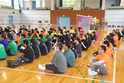 八代市PTAふらばーるバレー大会が東陽スポーツセンターで行われました。八代市内の小中学校PTAから24チームが出場して、熱い戦いが繰り広げられました。本校PTAチームは、予選パート6チームの中で、1試合目八代第五中学校PTAさんと2試合目八代小学校PTAさんと対戦しました。試合前には円陣を組んで士気を高めました。大会会場が地元ということでスタンドから大応援団が後押しをしてくれました。結果は1勝1敗で惜しくも決勝トーナメントに進むことはできませんでした。東陽中学校PTAチームさんが決勝トーナメントに勝ち進み、私たちは一生懸命応援しました。大会関係者・対戦相手・審判団・応援してくださった皆様、楽しい時間をありがとうございました。