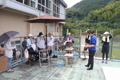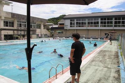 プール開放6回目がありました。この日は台風6号の影響で猛暑日となりました。ギラギラと日光が照りつける中、東陽支所のH様、東陽キッズクラブの職員の方、保護者の皆様に監視員を務めていただきました。参加した29人の児童の安全を見守っていただき、ありがとうございました。