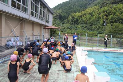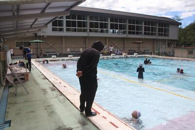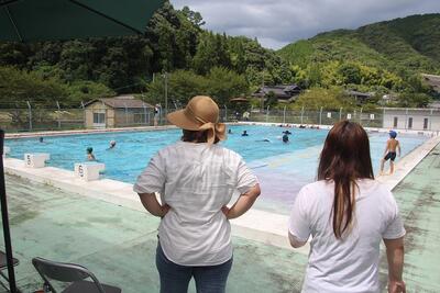 プール開放4回目。この日は43人の子どもたちが参加してくれました。始める前に、再度利用のきまりを守ることや、プール監視員の指示を守ることを確認していただきました。子どもたちの笑顔がずっと続くように、監視員の皆様は真剣な表情で子どもたちの安全を見守っておられました。猛暑日の中、プール監視員の皆様、ありがとうございました。