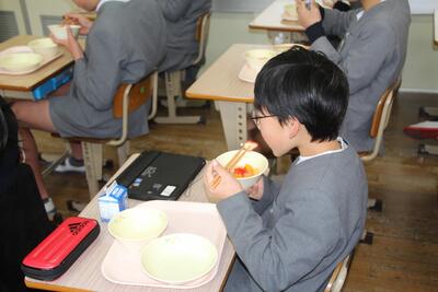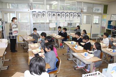 1月の食育の日(ふるさとくまさんデー)の給食メニューには、東陽町産のしらぬいとおひめさんだんご汁(菊池・山鹿地域の郷土料理)がありました。しらぬいは本校児童の祖父母の方が栽培されたもので、甘くてジューシーな味でした。おひめさんだんご汁のだんごの中にはサツマイモが入っていて、とても柔らかい食感でした。学校栄養職員のI先生から、しらぬいとデコポンの違いや、おひめさんだんごの名前の由来などの説明をしてもらいました。おひめさんだんご汁の中には大根や白菜・ネギなどの東陽産の野菜がたくさん入っていました。東陽町や熊本県の恵に感謝して、東陽っ子は笑顔でおいしくいただきました。給食に関わるすべての皆様、ありがとうございました。