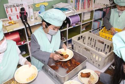 12月の食育の日(ふるさとくまさんデー)の給食メニューには、トマト衣のチヌの天ぷらがありました。八代産のまちべえトマトをドライトマトにして衣に入れ、八代市から無償提供されたチヌを天ぷらにしたメニューでした。この日は、東陽町で収穫された大根や白菜などを使ったみそ汁やサラダなどのメニューもあり、東陽っ子はおいしそうに食べていました。外は冷たい雨だったので、身も心もぽかぽかになりました。給食に関わるすべての皆様、ありがとうございました。