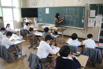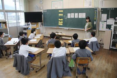 国語科では、物語「きつつきの商売」を使って、読んで想像したことを伝え合う学習をしています。この日は、2つの場面を読み取って整理していました。学習リーダーを中心に話し合いを進めました。読み取ったことを音読に生かしていきます。