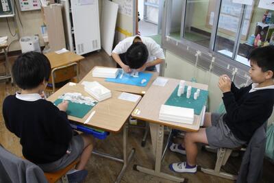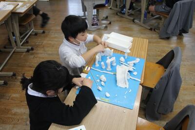 図工科では、住んでみたい町、あったらいいなと思う町の様子を想像し、建物や道などの形やそのつくり方を工夫して、ねん土を使って立体で表現する学習を行いました。友だちとねん土を合わせて一つの作品を作る経験はあまりないので、グループで協力していきいきと活動できました。