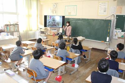 外国語活動では、"What's this?"という単元を学習しています。この日は、クイズを出して果物や野菜・食べ物などを答える学習でした。ヒント1果物、ヒント2黄色、ヒント3サルというようにスリーヒントを英語で出して、英語で答えるやりとりを行いました。はじめはALTのJ先生のクイズに答え、その後はみんなで尋ねたり答えたりして、楽しく活動しました。